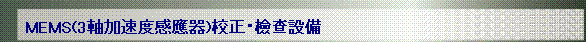 MEMS 3軸加速度感應器校正・検査装置 Micro Electro Mechanical Systems INDEX: ■MEMS(3軸加速度感應器)校正・検査装置 ・系統類型 ■MEMS用検査装置 ・MEMS 3軸加速度感應器量産用校正・検査装置基本機型 ・IC封裝 探針元件 ・對應角速度感應器 ・請與我們連絡! MEMS感應器代工検査業務的介紹 「MEMS加速度感應器検査装置」は、 経済産業省平成18年度中小企業・創業挑戦支援事業的實用化研究開発事業補助金的對象事業。 「MEMS加速度感應器検査装置」は、 平成18年度東京都中小企業振興公社的可能性評價制度選擇為推薦事業。 MEMS加速度感應器検査装置 ■ 實現XYZ3軸共0~360°任意控制的検査。 ・2軸:0~360°旋轉的簡易型 ・3軸:0~360°任意旋轉型 ■ 實現於-40℃~+85℃的自動検査。 ■ 提供感應器裝置形狀對應插槽或是探針元件。 ■ 選配:SECS/GEM通信介面 檢測頭以及檢測內容根據客戶的需求建構系統 ▼ 系統類型 機構 簡易型 360℃任意旋轉型 旋轉軸 1軸 0~360℃旋轉的簡易型 控制概念圖 2軸 0~360℃任意旋轉型 控制概念圖 檢測頭的拆裝 手動 手動 手動 自動 加熱槽 無 附 附 (無預冷預熱部) 付き (有預冷預熱部) 資料傳送 有線式 有線式 無線式or有線式 無線式or有線式 姿勢精度 ±1.0度 ※可指定 ±1.0度 ※可指定 ±0.5度 ※可指定 ±0.5度 ※可指定 測試温度 室温 -40℃~+85℃ -40℃~+85℃ -40℃~+85℃ 測試内容・項目 依據指定 依據指定 依據指定 依據指定 装置例 右45度旋轉 左45度旋轉 回到上方 下一頁